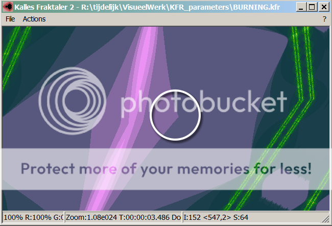 Since the new burning ship perturbation feature, I'm dedicated to make some (deep) zoom video into this fractal. It's nice to explore, since it shares many properties of the Mandelbrot set. But the shapes are more confusing, so my time in the old mset really pays off. The bigger contrast in iteration-density ask for other color method. Playing around with the palette option is certainly helpfull, but I still think another (or additional) method is better. For example see http://www.juliasets.dk/FractalsAndArt.htm Running Kalles with Wine under Linux is doable, but brings some challenges. For example the Key Frame Movie maker does not have much codecs to choose from. So I render non-compressed video, extract all images with mplayer, scale them down for antialiasing and putting them back into a movie with mencoder. This process could be more streamlined, if the keyframe maker could store JPG or PNG directly. Like the program Xaos for example does. Don't get me wrong, the program so far is wonderfull. Though I might seem a little impatient and pushy, I really respect your work. Keep up the good work!  Thanks! But it is and will always be an experimental prototype  It should be possible to create jpeg images though. I just did an e110 zoom sequence with stored jpeg images, and monitored the usage of handles, user objects and GDI objects, and it worked as expected. Maybe there is a problem with the jpeg images because of wine... Or maybe you minimized KF while rendering, which I didn't test that but I know was causing problems before? Can you test a render without minimizing KF? (if you are afraid of breaking the render by accidentally clicking in the window - I usually open the "Iterations" dialog, to monitor interesting stuff, which is modal and blocks the main window - but don't click OK in that dialog...)