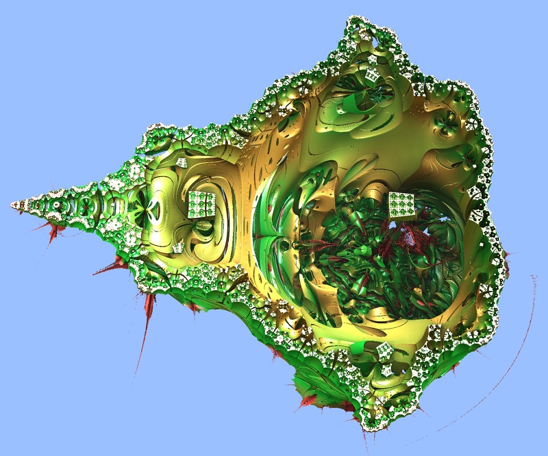 ok, here is another example of formula combination, only 2d, i am sorry, this image has been created with the mandelbox formula after iteration 5  Fractal1 { fractal: title="Fractal1" width=640 height=480 layers=1 frame=60 credits="c.Kleinhuis;3/5/2010" layer: caption="Background" opacity=100 mapping: center=-0.75605792705/0.0173250805 magn=1.2214028 formula: maxiter=250 filename="Standard.ufm" entry="GenericFormula" p_formulaClass="ck.ulb:ChangeFormula_AfterNIterations" p_formulaClass.v_generic=100 p_formulaClass.v_formula=100 p_formulaClass.p_power=2/0 p_formulaClass.formulaClass1="Standard.ulb:Standard_Mandelbrot" p_formulaClass.formulaClass1.v_generic=100 p_formulaClass.formulaClass1.v_formula=100 p_formulaClass.formulaClass1.v_divergentformula=100 p_formulaClass.formulaClass1.start=0/0 p_formulaClass.formulaClass1.p_power=2/0 p_formulaClass.formulaClass1.p_bailout=4 p_formulaClass.formulaClass2="ck.ulb:Mandelbox" p_formulaClass.formulaClass2.v_generic=100 p_formulaClass.formulaClass2.v_formula=100 p_formulaClass.formulaClass2.p_power=2/0 p_formulaClass.formulaClass2.v_divergentformula=100 p_formulaClass.formulaClass2.p_bailout=1E20 p_formulaClass.formulaClass2.seed=0/0 p_formulaClass.formulaClass2.scaleval=2 p_formulaClass.atIteration=10 inside: transfer=none outside: transfer=linear filename="Standard.ucl" entry="Smooth" p_power=2/0 p_bailout=128.0 gradient: smooth=yes rotation=1 index=0 color=6555392 index=64 color=13331232 index=168 color=16777197 index=257 color=43775 index=343 color=512 opacity: smooth=no index=0 opacity=255 }