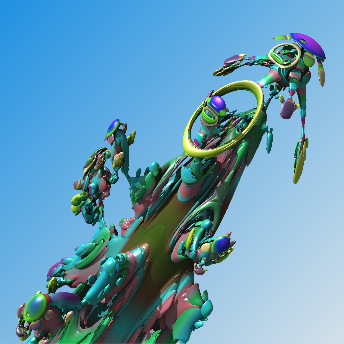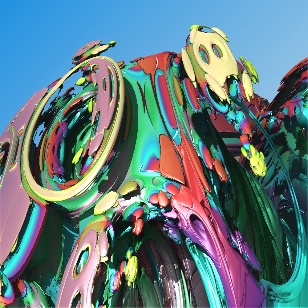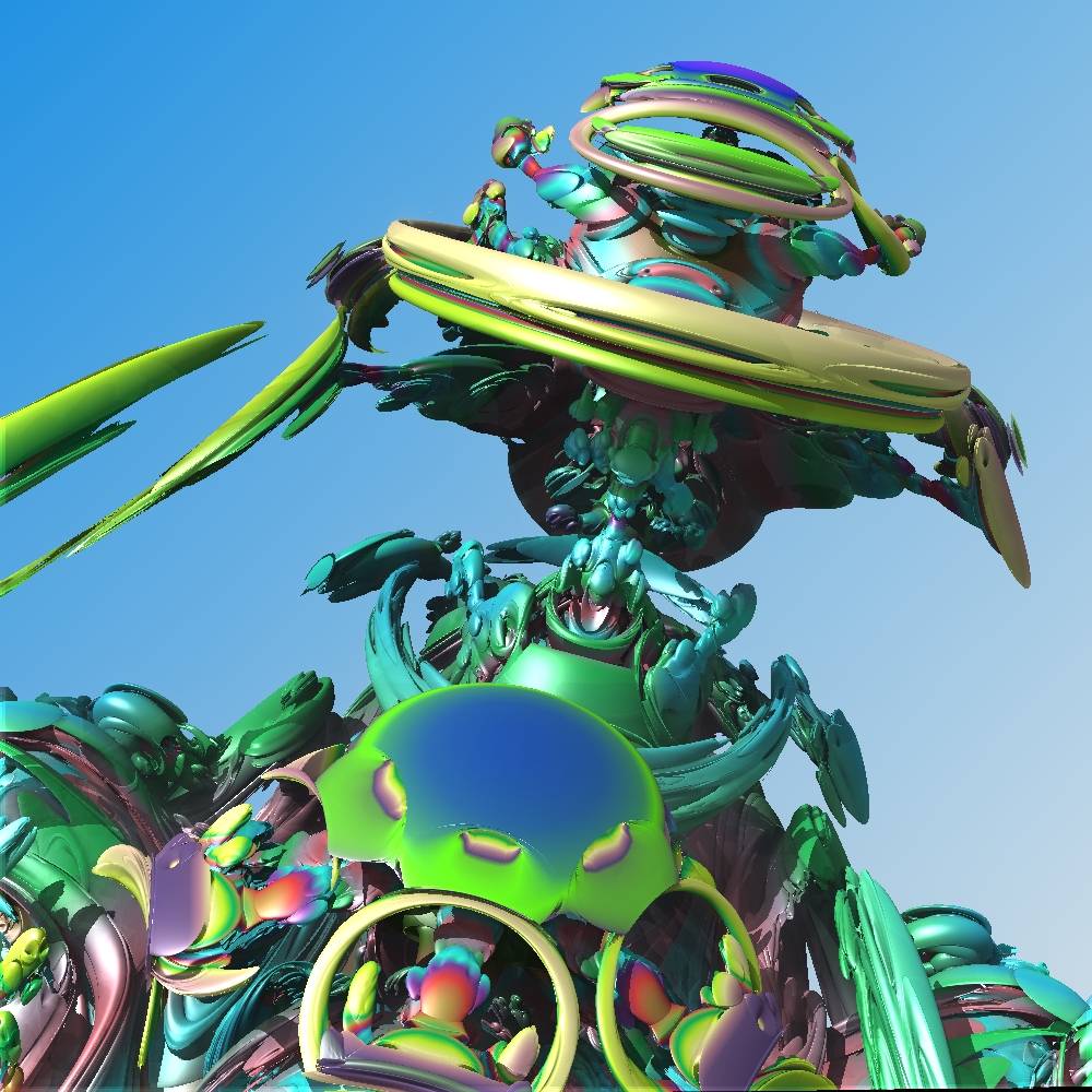 This construction has lots of knobs to play with. I hope at some point to create a 3D fractal version of the old biomorph game.
