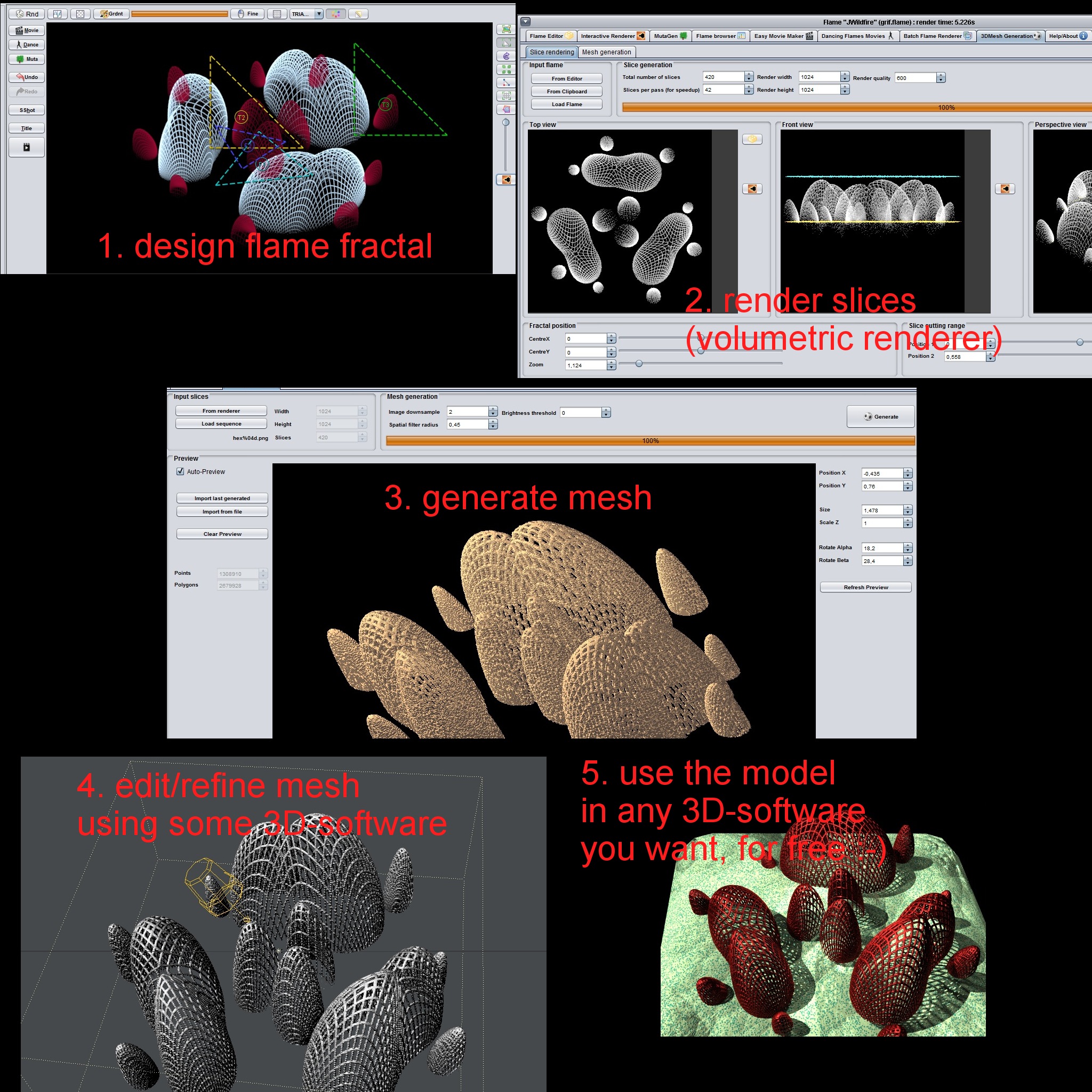 - the mesh-generator supports additional smoothing and can process any image-stack in the formats supported by JWildfire. So probably you could also convert Mandelbulb3D Voxelstack by using this modeule (I have not tried it, so any feedback is welcome)