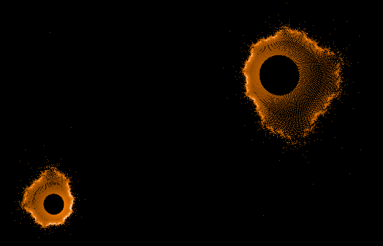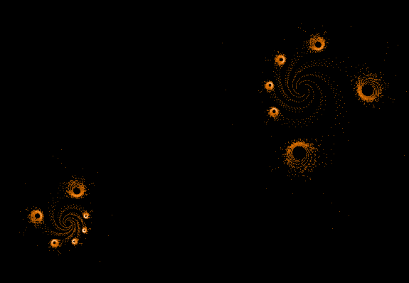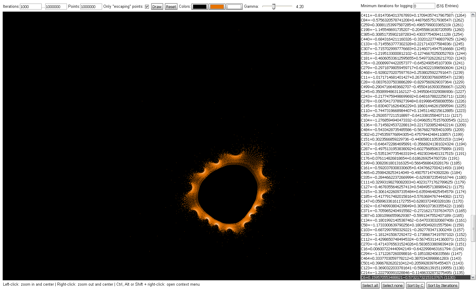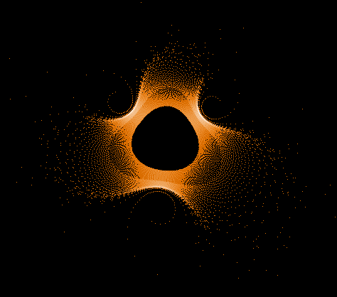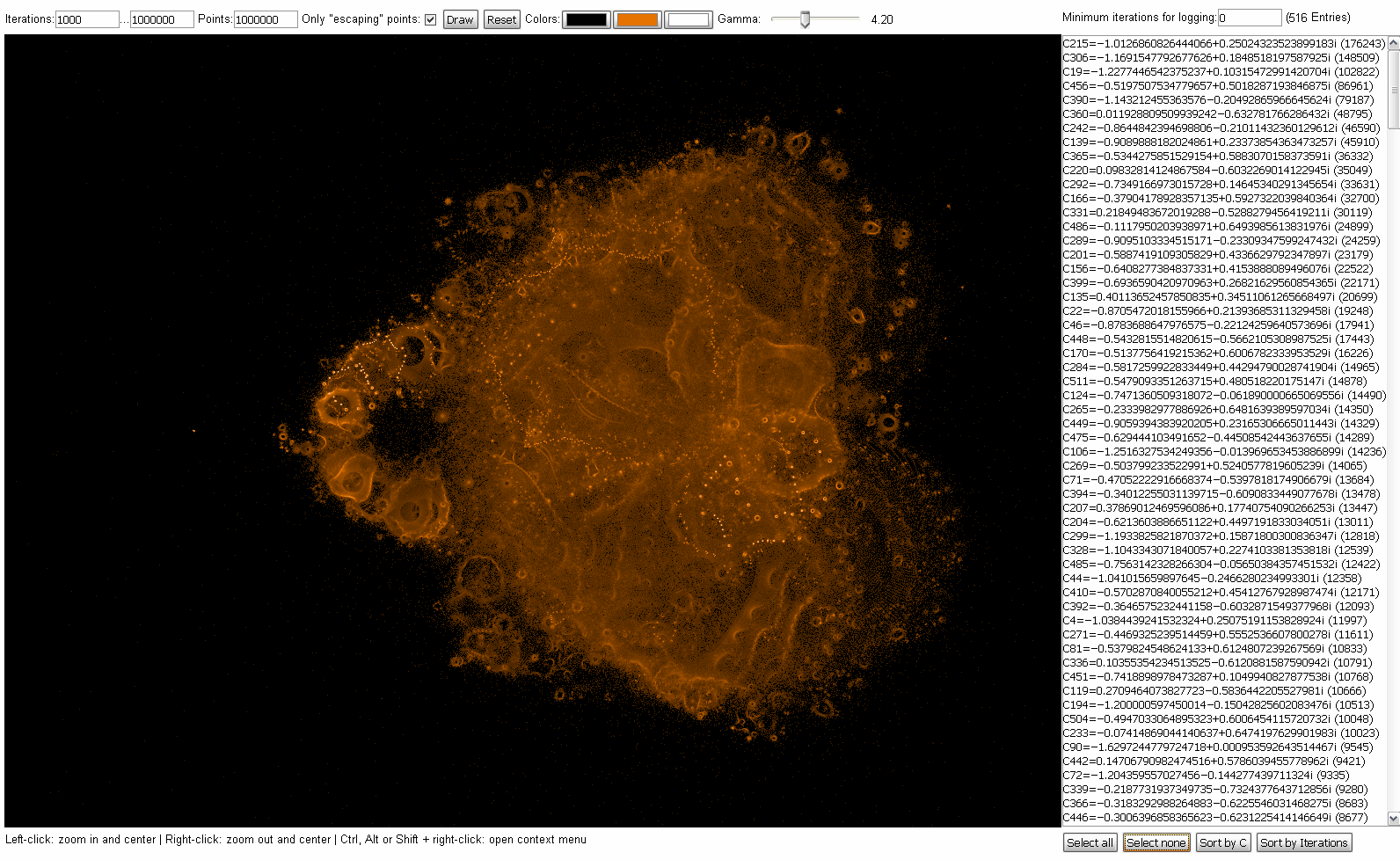 @Chillheimer: To prove your theory I modified my little JavaScript app which displays the "path" of the Z values for a given C point so that it can now display dots instead of lines. The pattern of some Z value sequences near the rim of the Mandelbrot set are looking very similar to the "ring" objects which appear in the "Buddhabrot" pictures:  So I think, this, in combination with the random values, is the explanation for the visible asymmetries and the differences in each picture (despite equal parameters). I just rendered a second image, using the same parameters as image number 3 in the first post of this thread - and as expected, it looks different. For comparison purposes, here are the two images - the old one and the new one - each of them rendered with 1 million max. iterations and 1 million random points:   It's really cool that - other than the normal Mandelbrot set - each image is a new surprise due to the usage of random values...  Regards & good night, Stefan (P.S., for those who try the JavaScript program: I mistakenly stated that the image was colored using the "sinus shape" linearity. In fact, it was the logarithmic gradient. Using other linearity methods will give only a very dark picture.)