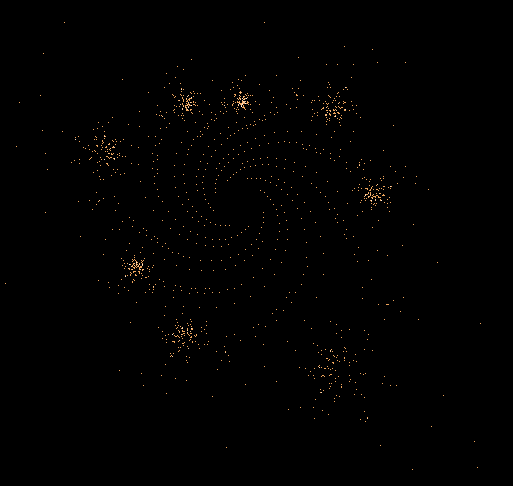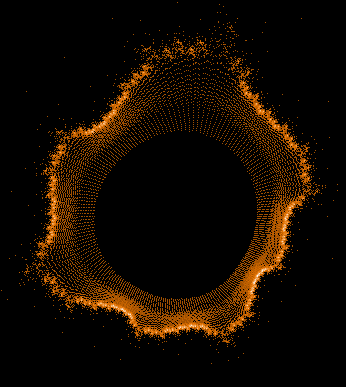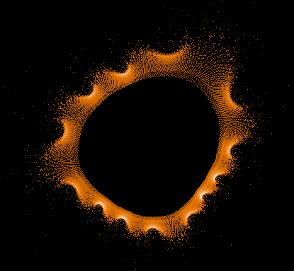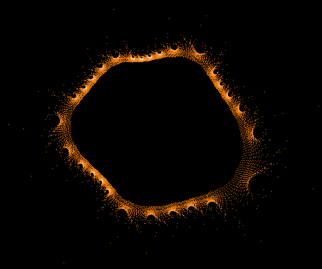 The shape looks similar to the above mentioned "rings" in my picture number 3. I love it that this image is nothing but one pair of coordinates put into z->z²+c showing the path that number takes until it finally after millions of iterations is "allowed to escape to infinity"... that incredible complexity, not just in the whole set, but in a single escape orbits - and there are many other forms and shapes to explore.